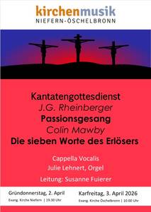 Herzliche Einladung zum Kantatengottesdienst an Gründonnerstag, 2 April 2026 um 19.30 Uhr. Dieses Jahr erklingt Musik für Chor und Orgel. Die cappella vocalis wird begleitet von Julie Lehnert, die aus Pforzheim stammt und zur Zeit in Hamburg Kirchenmusik studiert. Die Leitung hat Kirchenmusikerin Susanne Fuierer.